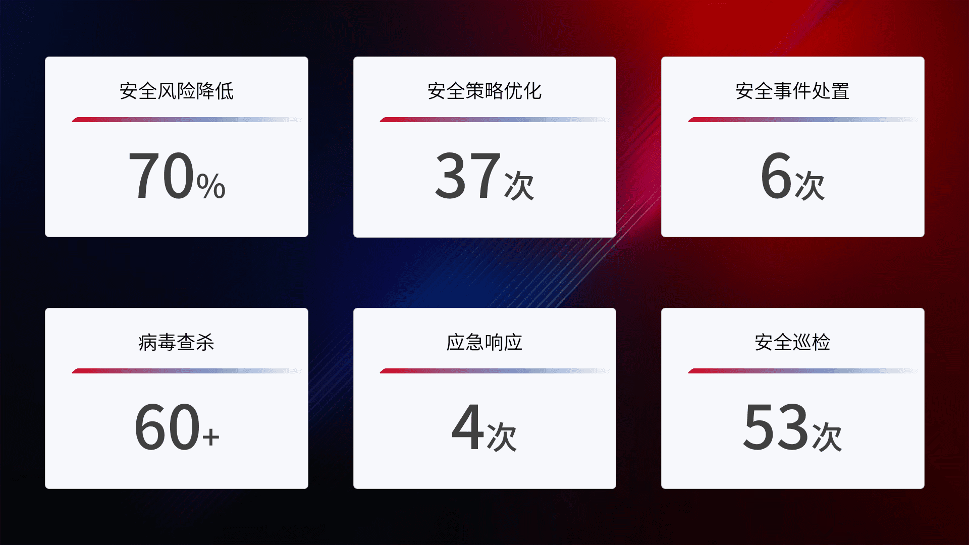 提供全面的安全事件报告体系,,,,包括处置报告、、周报、、季度和年度总结,,结合持续监控,,,帮助客户深入了解网络安全状况。。。。